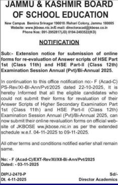 In continuation to this office notification no:- F (Acad-C) PS-Rev/XI-BI-Ann/Pvt/2025 dated 22-10-2025, It is hereby Informed that all the eligible candidates who could not submit their forms for revaluation of their Answer Scripts of Higher Secondary Examination Part 1st (Class 11th) and HSE Part-ll (Class 12th) Examination Session Annual (Pvt)/Bi-Annual 2025, can now submit their online revaluation forms on official website of JKBOSE ww.jkbose.nic.in as per the extended schedule w.e.f. 04-11-2025 to 09-11-2025.