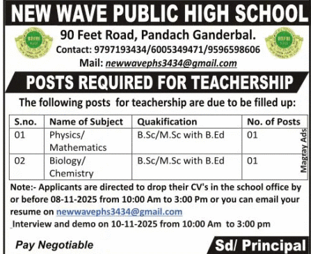 Note: Applicants are directed to drop their CVs in the school office by or before 08-11-2025 from 10:00 AM to 3:00 PM or you can email your resume on newwavephs3434@gmail.com