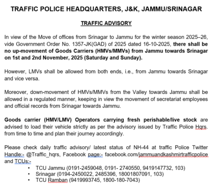 In view of the Move of offices from Srinagar to Jammu for the winter season 2025–26, vide Government Order No. 1357-JK(GAD) of 2025 dated 16-10-2025, there shall be no up-movement of Goods Carriers (HMVs/MMVs) from Jammu towards Srinagar on 1st and 2nd November, 2025 (Saturday and Sunday).